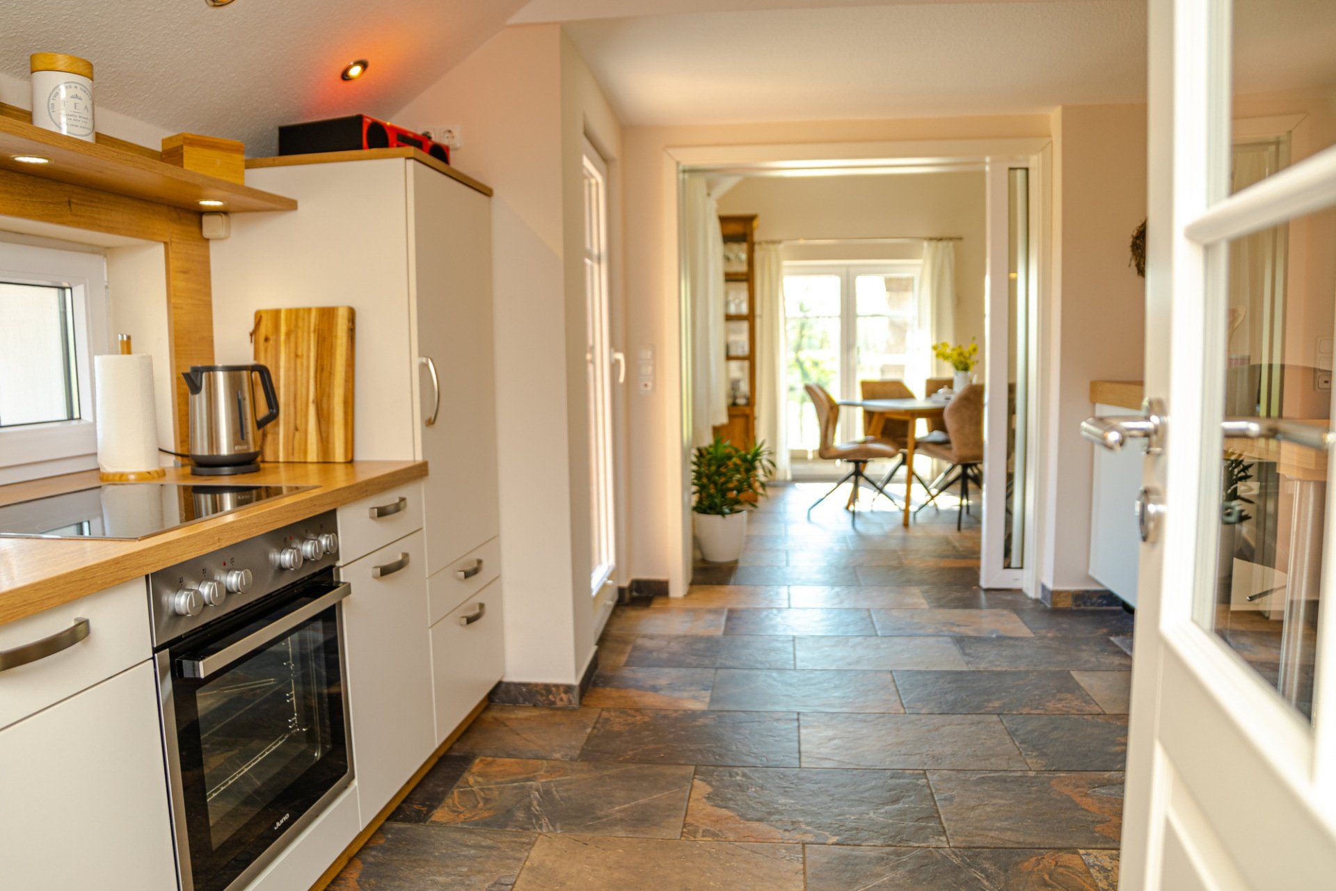 Komplett eingerichtete Küche mit Backofen, Herd, Mikrowelle, Wasserkocher, Eierkocher, Geschirrspülmaschine, Kaffe- und Espressomaschine
